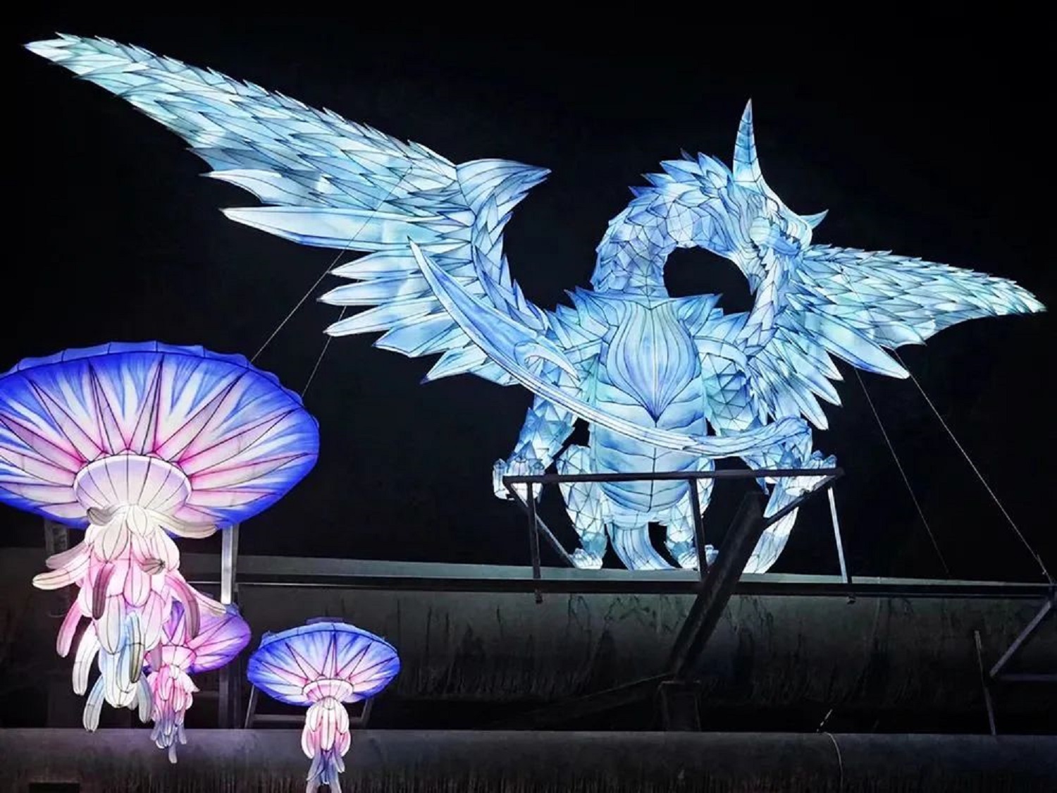 綠意盎然的“哈密瓜通道”、成群結(jié)隊(duì)的“翼龍家族”、高達(dá)6米的“恐龍戰(zhàn)士”、盤繞在鋼筋水泥之間的“機(jī)械水母”……一盞盞結(jié)合了自貢傳統(tǒng)工藝與現(xiàn)代光影技術(shù)的彩燈次第點(diǎn)亮,極具蒸汽朋克風(fēng)格的大膽設(shè)計(jì)與哈密特色文化完美融合,營造出動畫世界般的奇幻感受。