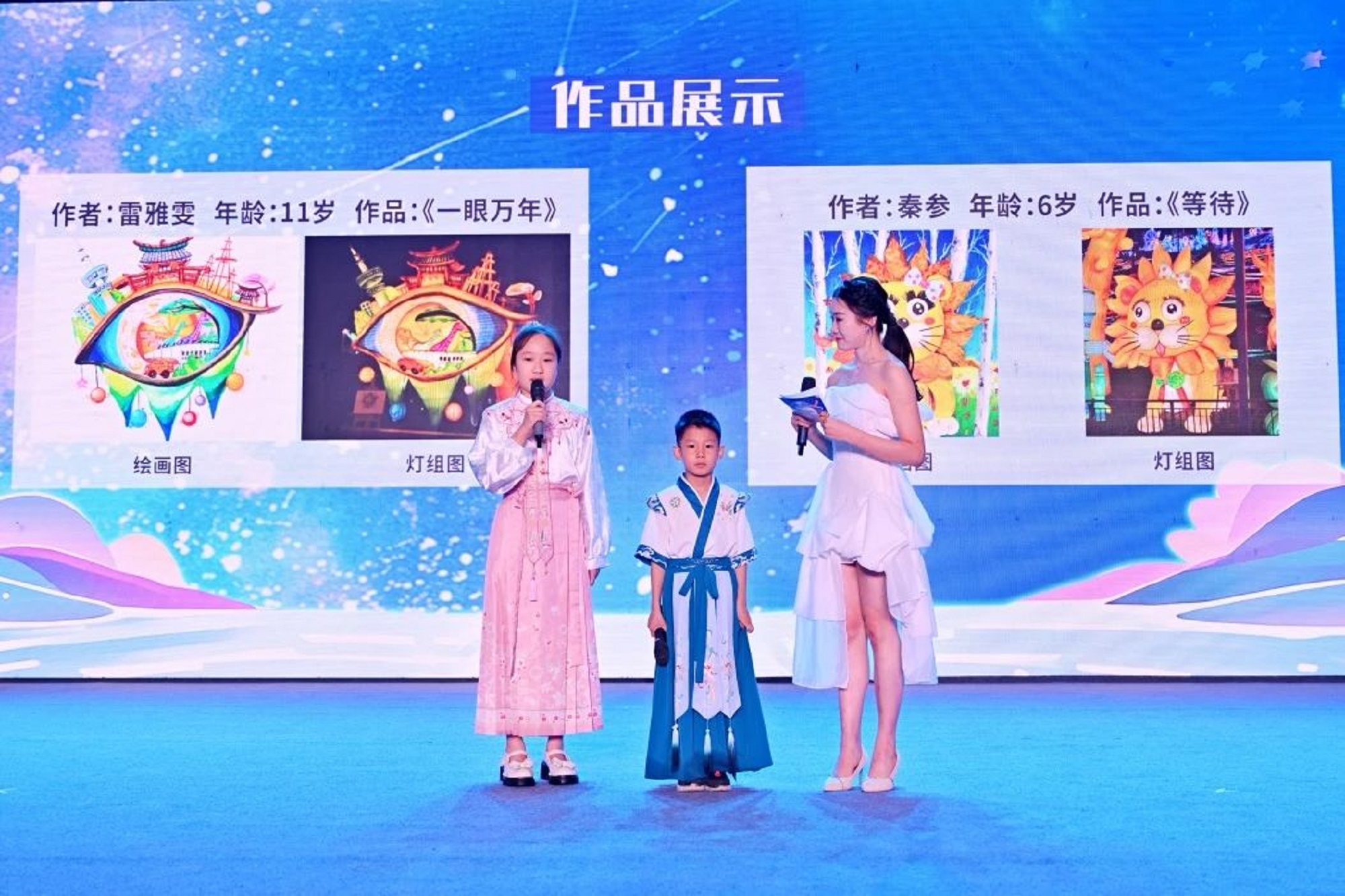 第二屆活動的獲獎“小藝術(shù)家”們也來到現(xiàn)場分享創(chuàng)作感想及獲獎喜悅。6 歲的武漢小朋友秦參走上舞臺,眼睛亮晶晶地講述:“去年春節(jié),我畫的小獅子‘跑’到了第 31 屆自貢國際恐龍燈會!看到它亮閃閃地站在彩燈群里,就像從畫里活過來一樣,我開心得晚上都睡不著覺!” 自貢本地女孩雷雅雯則詩意滿滿:“每當提起畫筆,家鄉(xiāng)的鹽井、彩燈就浮現(xiàn)在眼前。希望通過我所創(chuàng)作的《一眼萬年》,讓全世界看到了自貢的美?!?據(jù)悉,她的作品經(jīng)短視頻傳播后,收獲超千萬播放量,連《人民日報》新媒體都為其點贊并轉(zhuǎn)載?!敖衲辏疫€要畫出更酷的作品投稿!”雷雅雯說。