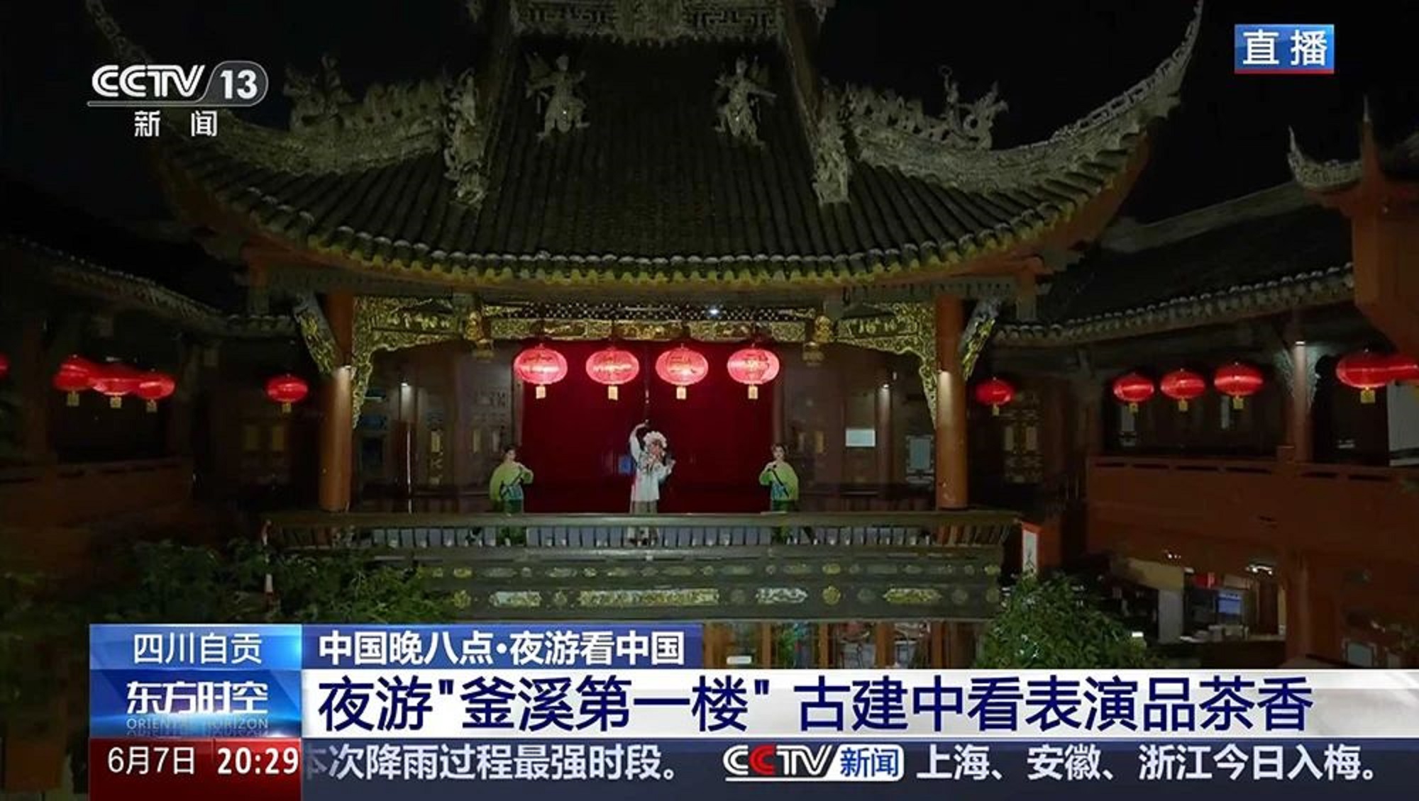 在長達近7分鐘的直播連線過程中,主持人搭乘游船緩緩穿行于釜溪河道,沿途欣賞由現(xiàn)代聲光電技術(shù)和傳統(tǒng)自貢彩燈技藝融合打造的燈組及光影秀,帶領(lǐng)觀眾來到“釜溪第一樓”王爺廟,看表演、品茶香,體驗裸眼3D光影秀帶來的視覺震撼。